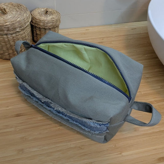 Large gray cosmetic bag made from upcycled jeans